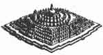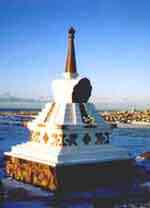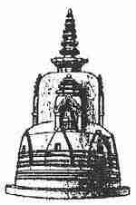 piece continues: As the Buddhist teachings point out, every element of a buddha's physical body is pervaded with enlightenment. Thus, even after cremation, the teacher's remains are considered sacred, because they are the distilled essence of his or her physical form and are therefore themselves the embodiment of enlightenment. Because it enshrines these relics, the stupa is powerful. It is said that in venerating the stupa, one can "meet" the teacher. The visual impact of the stupa on the observer brings a direct experience of inherent wakefulness and dignity. Stupas continue to be built because of their ability to liberate from confusion simply upon seeing their structure. The shape of the stupa represents the Buddha, crowned and sitting in meditation posture on a lion throne. His crown is the top of the spire; his head is the square at the spire's base; his body is the vase shape; his legs are the four steps of the lower terrace; and the base is his throne. The stupa also symbolizes the five elements and their relationship to enlightened mind. These are the essential attributes of a fully realised human being: the base of the stupa signifies earth and equanimity; the dome, water and indestructibility; the spire, fire and compassion; above the spire, wind and all-accomplishing action; and at the very top, the jewel represents space and all-pervading awareness. The stupa is a mandala, or sacred arrangement, containing all of these enlightened qualities." If you are interested in the old Indian stupas, visit the page on Sanchi and Ajanta. To get at some more pages, go back up to the top And here is a page of photos of an old stupa in Afghanistan. Tony, who sent me the pictures writes: "It is at the ancient, well preserved site of a Buddhist cave monastery. It was probably destroyed by raiders from the north in about 460 CE (AD). The site was excavated in 1959-60 and was only slightly damaged in the 25 years of war. The stupa is hewn into the solid rock of a large hill - and so cannot be seen from the foot of the hill - it has entrances through caves at the foot of the hill. From a distance all that can be seen is the square relic chamber on the top."