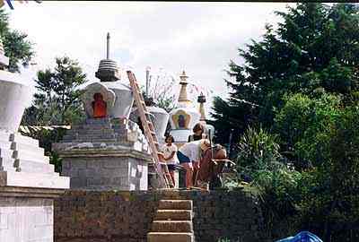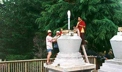 Ven Lama Shedrup blessing the mantras in the neck: in this case, the mantras are sealed in glass jars, which are pushed into the wet concrete as it is poured. |