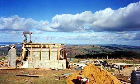 That's the crew: Lama, Michael, Mary and Sara. Michael spent a lot of time bringing water in large pickle barrels from the local town, as there wasn't any on site, and you use an amazing amount mixing concrete. |